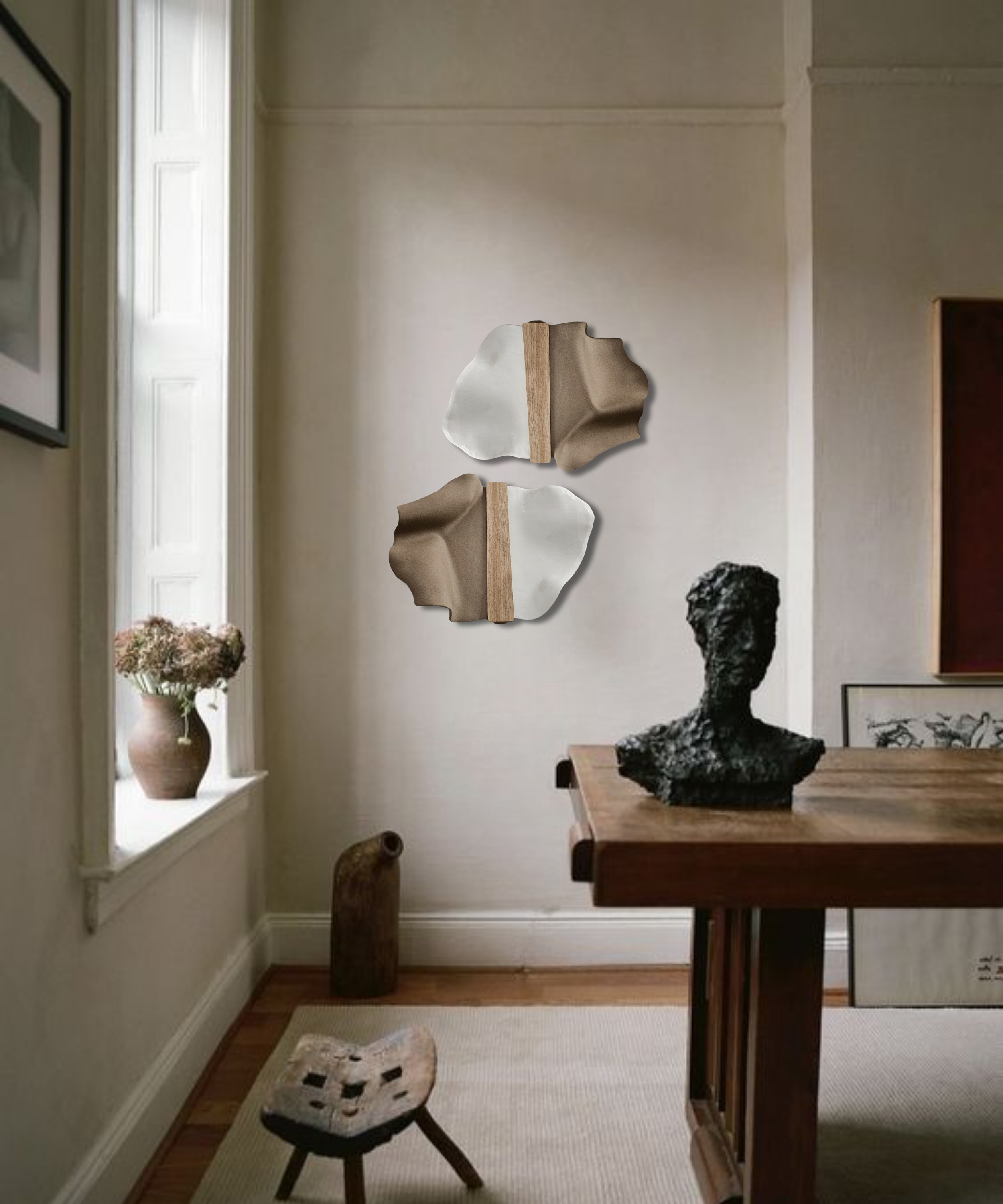 My practice started with vases and small sculptures, and now focuses on sconces and larger wall sculptures, mostly built from raw clay, with a limited use of decorative elements.